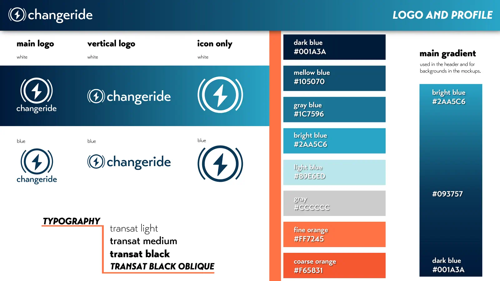 En gjennomarbeidet profilmanual sørger for konsistent bruk av farger, typografi og grafiske elementer, og gir Changeride et solid grunnlag for videre utvikling og markedsføring.